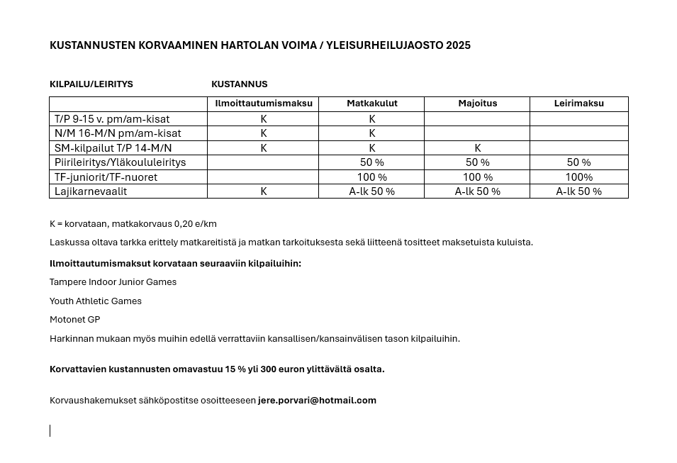 Vuoden 2025 yleisurheilun kustannusten korvaaminen on alla olevan taulukon mukaisesti päätetty jaoston kokouksessa lokakuussa 2025.